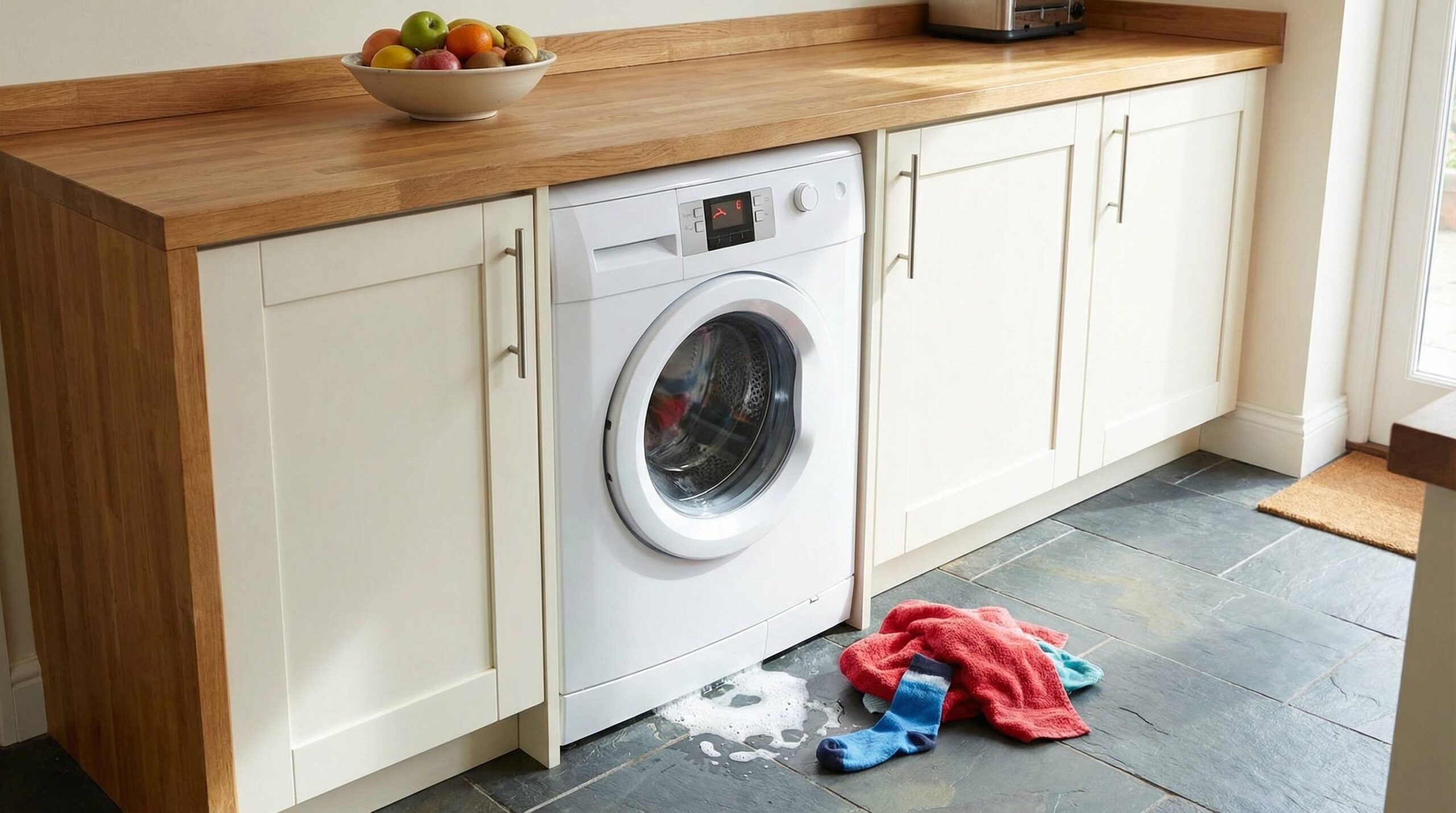 - Restwasser: Eimer/Schüssel und Tücher bereitlegen; beim Öffnen des Flusensiebs läuft Wasser aus.