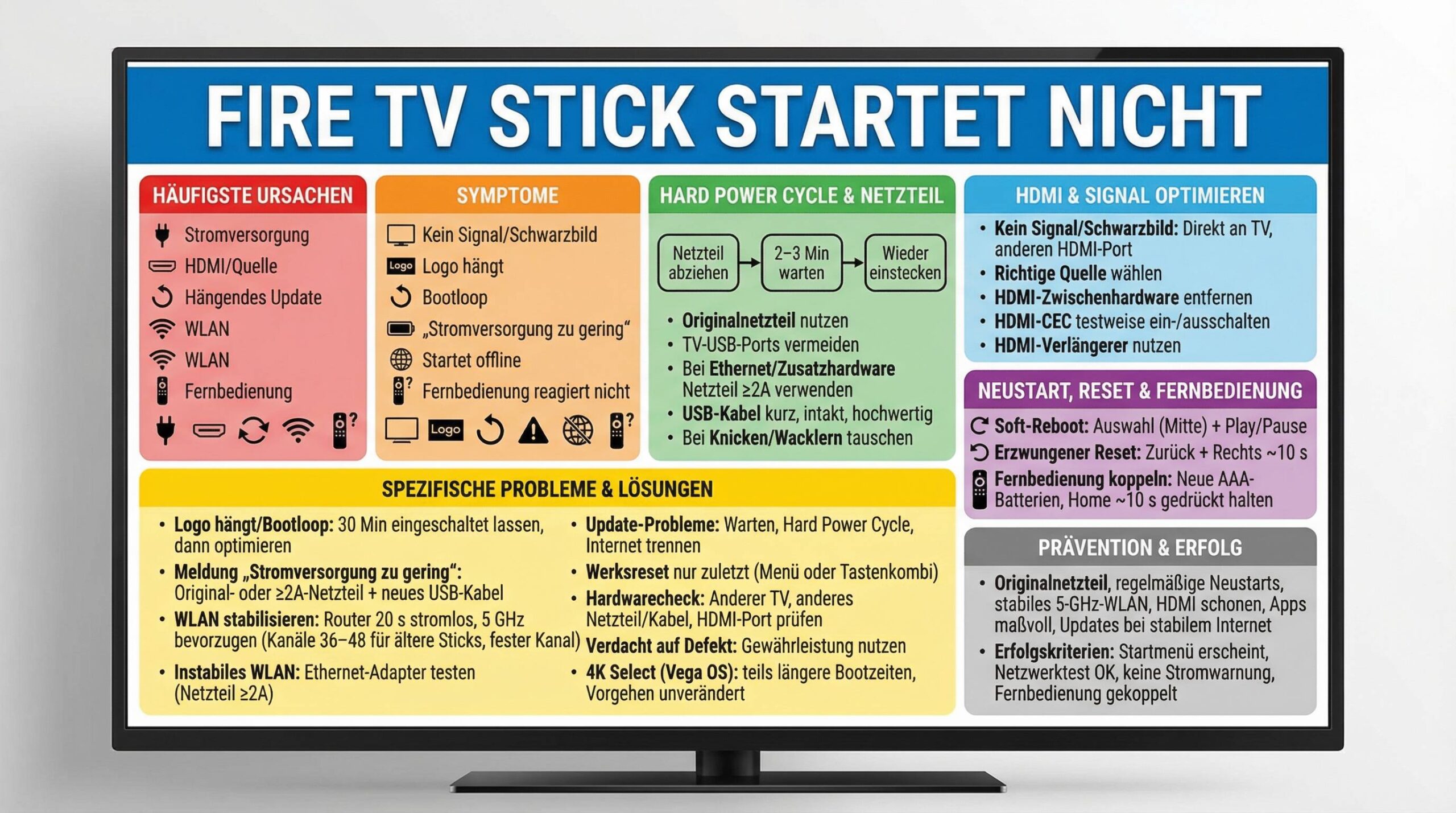 | Nach Reset weiterhin Probleme | Hardwaredefekt | Anderer TV/Netzteil/Kabel testen, Support/Umtausch | Defekt bestätigt → Austausch |